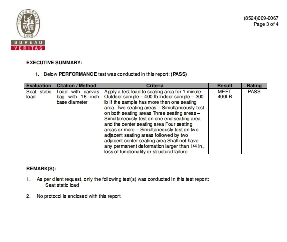 With certification from Bureau Veritas, our customers can be confident that the quality, safety and environmental performance of the outdoor sofa they choose has been fully assessed and certified. This certification underscores our commitment to delivering quality outdoor furniture that meets the highest industry standards, giving our customers peace of mind and satisfaction when creating their ideal outdoor living space.